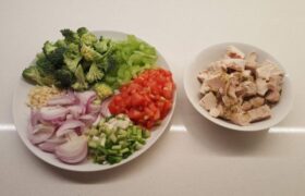 Skær kyllingekød i store tern, ca 1,5 x 1,5 cm.