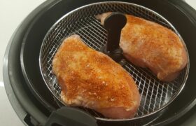 Smør kyllingebrysterne med lidt olivenolie og drys med barbecue krydderi. Kom dem i kurven i din Actifry (eller i ovnen) og steg dem i ca. en halv time.