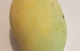 Mangoen er fra vores eget træ i haven – de er begyndt at falde ned af sig selv, og så er de modne.