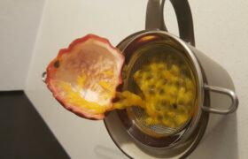 Til dressingen tages kødet ud af en passionsfrugt og sies, hvis man ikke bryder sig om kernerne. Bland det med olie, knust hvidløgsfed, salt og peber. Kom dressingen over salaten og pynt med lidt (thai) basilikum.