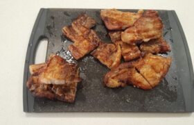 Skær flæsket i skiver med sværen på og tør det godt med køkkenrulle.